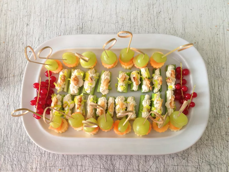 | Party-Käsespieß mit Trauben Käsewürfel mit Obst als Käse-Igel (ca. 25 Stück) Tomaten-Mozzarella Spieße Hähnchen-Ananas-Spieß Mini-Wraps Mini-Laugenbrötchen Mini-Partybrötchen Croque Monsieur Bruschetta Mini Pizza Mini Frühlingsrolle Party Schnitzel Party Frikadellen Tramezzini Ziegenkäse im Schinkenmantel Kirschtomaten mit Käsemousse Purpemickel mit Frischkäse Blätterteighäpchen Laugenecken Brie-Spitzen Mini Brioche Fischbälchen Spieße Rohkostplatte, mit Dip | 821 |